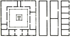Para 1840, las cabañas fueron reemplazadas por el barracón de patio, una construcción toda de mampostería de 80 a 20 varas[11] de lado como medida estándar. No era una tipología que se repetía, inclusive existieron de mayor tamaño, dependiendo de la cantidad de esclavos que se tenía a su haber, posiblemente con 120 varas por 80 como también de 170 varas de largo por 100 de ancho. En el barracón de nave, las mismas podrían contar con 6 naves, cada una con 15 cuartos, en total 90 habitaciones.